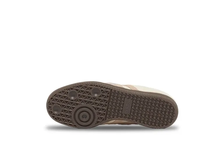 The Adidas Samba LT features a Cream White leather upper, Warm Sandstone suede overlays, and Gold Metallic accents, blending vintage style with modern flair. A gum sole completes the timeless, versatile design.