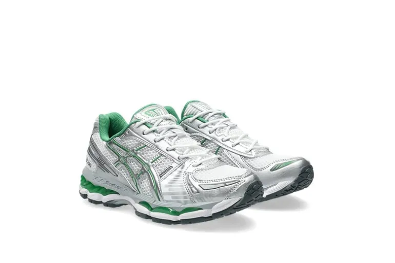 De Asics Gel-Kayano 12.1 White Pure Silver, ontwikkeld in samenwerking met KITH, combineert strakke crème- en zilvertinten met Gel-demping voor comfort, stijl en prestaties.