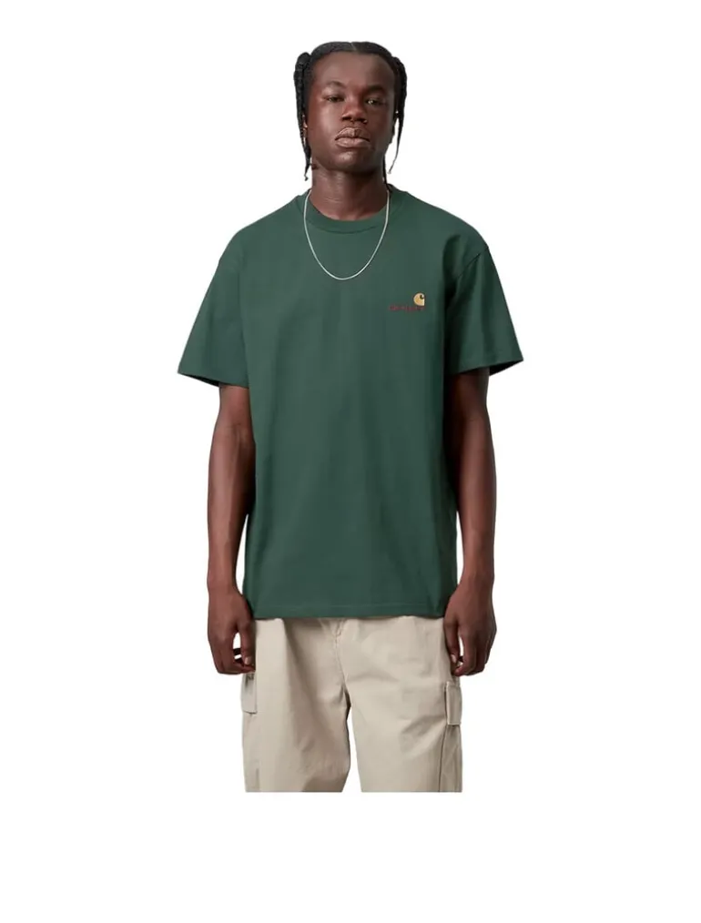 Carhartt WIP S/S American Script T-shirt in Kale Green — korte mouwen, iconisch logo, relaxte pasvorm, aardse groene kleur.