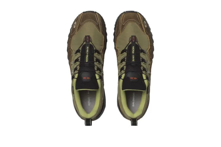 De Salomon ACS+ Escape Aloe Dark Earth Burnt Ochre is een duurzame outdoorschoen met aardse tinten, ontworpen voor stabiliteit en grip op ruig terrein, ideaal voor trailrunning en wandelen.