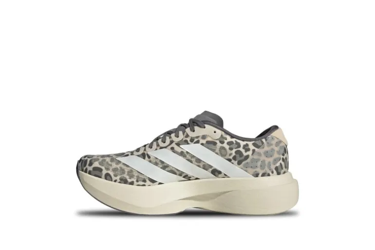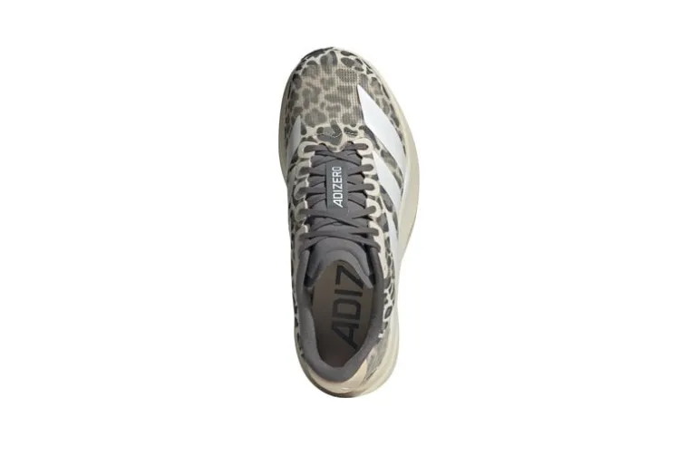 De Adidas Adizero Evo SL Leopard Zero Metallic Grey Four heeft een strak grijs design met luipaardprintaccenten, een lichtgewicht constructie en metallic details voor snelheid en stijl.