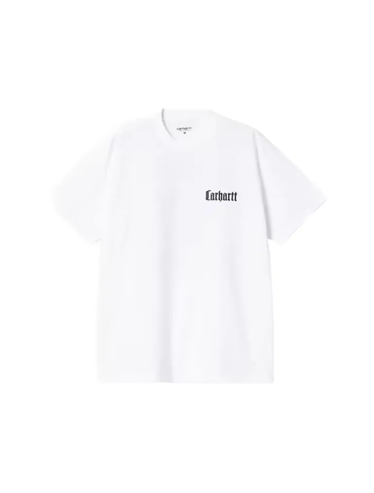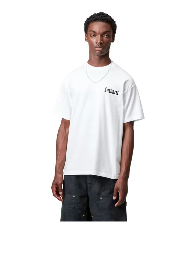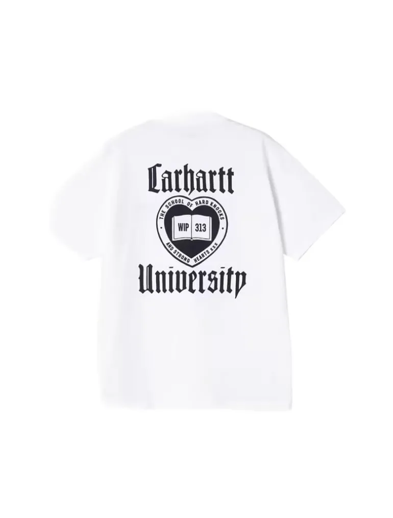 Het Carhartt WIP S/S Schooling T-shirt in het wit is een katoenen T-shirt met korte mouwen en een eenvoudig, strak design met het Carhartt WIP-logo of een afbeelding, in klassiek wit.