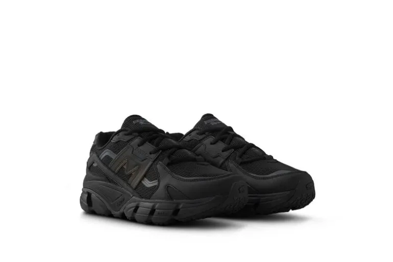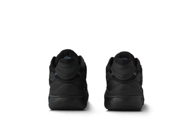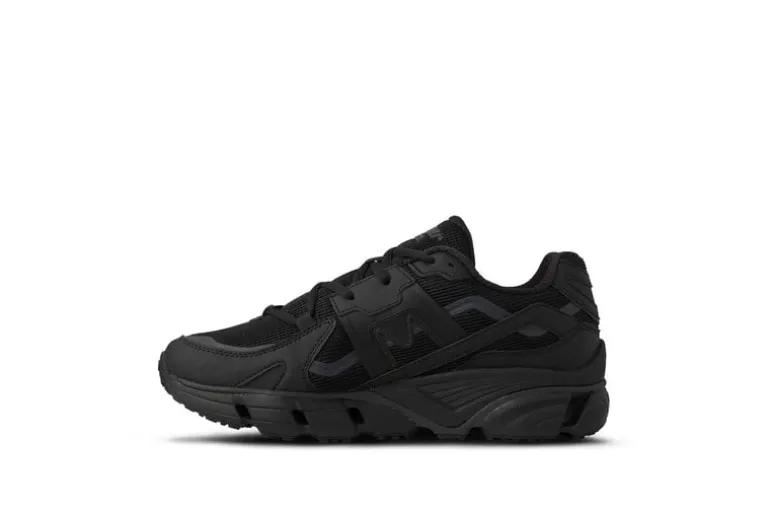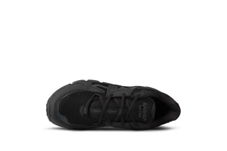 De Karhu Super Fulcrum in de kleuren zwart en zwart — een strak, minimalistisch ontwerp met een volledig zwarte bovenkant en zool, die een veelzijdige en stijlvolle look biedt die geschikt is voor verschillende soorten casual en sportieve kleding.